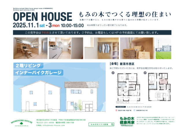 もみの木の家の完成見学会を開催致します! 令和7年11月1日(土)~3日(月・祝) 時間は10時~17時になります。 場所は、新潟市西区です。 ご予約いただいた方には、見学会会 ... 続きを読む »
